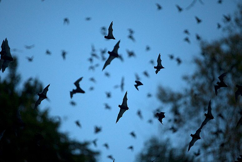 el ocaso, se puede escuchar el intenso zumbido de millones de murciélagos que